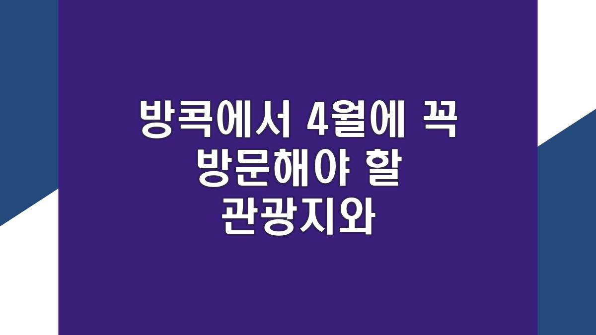 방콕은 태국의 수도이자 동남아시아의 문화와 번화함이 어우러진 도시로, 매년 많은 관광객들이 방문합니다. 4월은 방콕의 더위가 본격적으로 시작되는 시기로, 이 시기에만 느낄 수 있는 매력이 있습니다. 날씨가 더워지면서도 다양한 축제와 활동이 펼쳐지므로 여행하기에 좋은 시점입니다. 방콕의 다양한 도시 관광지를 미리 알아보고, 필요한 여행 준비물을 리스트업하면 더욱 즐거운 여행이 될 것입니다. 방콕에서의 멋진 순간을 놓치지 않으세요.